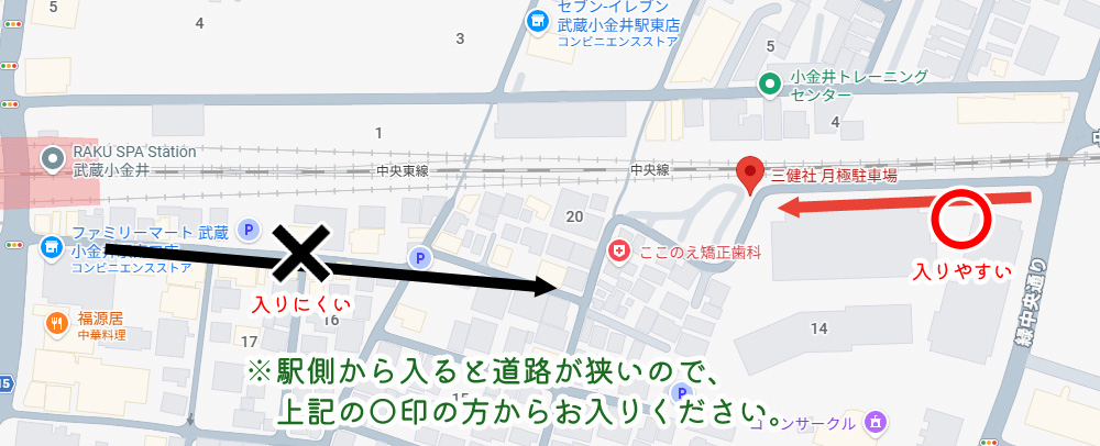 | 駐車場 | 三健社 月極駐車場(3台有) 東京都小金井市緑町5丁目4-15 ※1 「専用駐車区画 13,14,15」 駐車区画に止めた際は、駐車した番号を申し付けください。 ※2 指定区画外の駐車やポイ捨てはご遠慮ください。 トラブル防止にご協力ください。 |